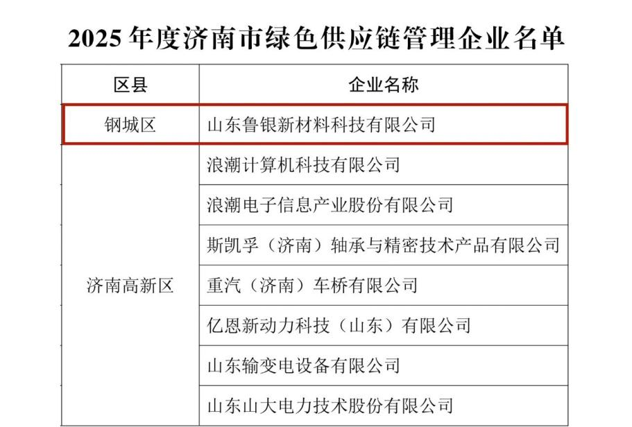 近日,济南市工业和信息化局正式公布2025年度济南市绿色制造单位名单,山东鲁银新材料科技有限公司凭借在绿色制造与供应链协同方面的积极实践,成功获评“济南市绿色供应链管理企业”认证,标志着公司推动产业绿色转型、践行可持续发展的努力获得权威认可。